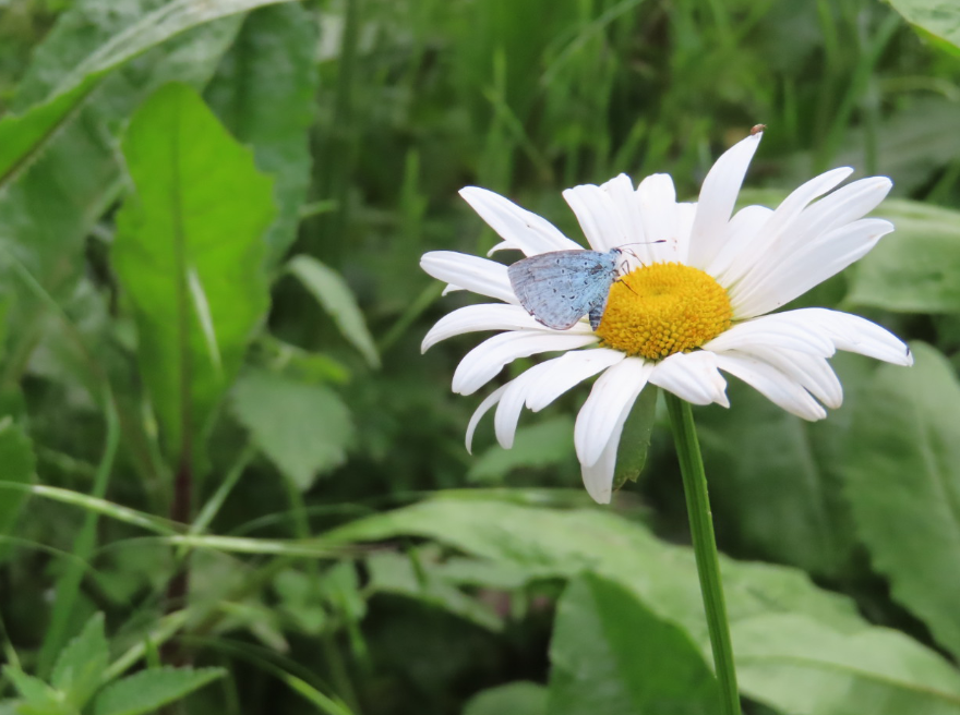 So, I sit down on a bench near a blue butterfly on a daisy. We don’t have many blue butterflies in the UK but which one is this? Could it be a Common blue? Or a Holly Blue? I’ve looked it up but they all look a bit alike to me so I can’t be sure—but whichever one it is it’s very beautiful. I’d like to know which one it is though…I know Holly blues eat nectar on flat headed flowers like this daisy…