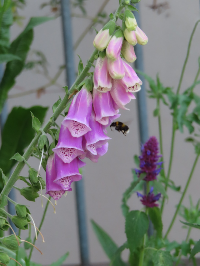 A bee buzzes into a foxglove and I wonder what type of bee is that? I know the bees for this type of bell-like flower need to have long whatever they’re called to get what they are after—you can probably guess that I have a lot to learn in the knowledge of our wonderful wildlife!— I’ll Google it!