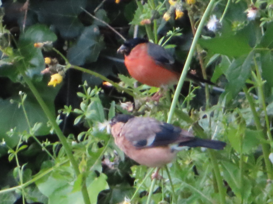 Ok, the picture is a little ‘soft’ focus, but the birds were some distance away and my camera did it’s best without a tripod. Blurred images may not win any photographic competitions, but can still be useful in identifying species and used as ‘evidence’ shots of sightings. The bullfinches are enjoying a breakfast on the plant hawksbeard which some gardeners refer to as a ‘weed’.
