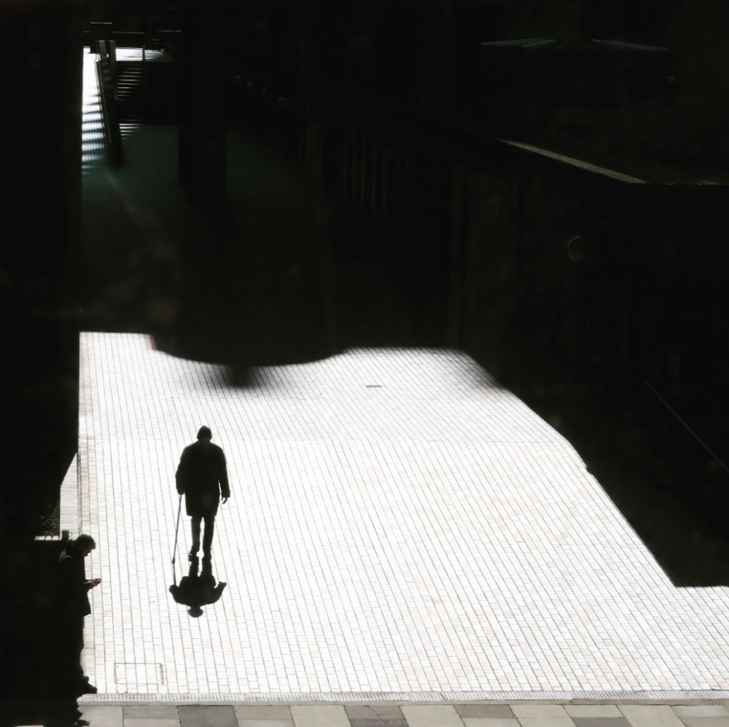 A lone vulnerable person takes a gentle brave stroll out of doors