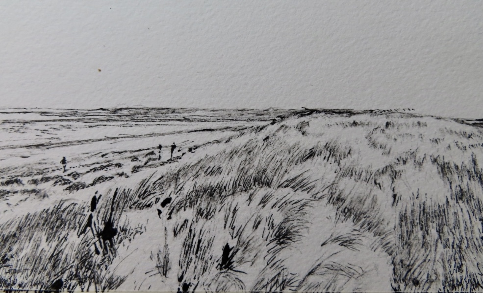 The drawing recalls a time from a happy family holiday. I remember clambering and sliding down the sandy path to catch up with my boys (they are the tiny figures in the distance on the beach) to the sound of the glorious song of the Skylarks that were soaring up and down from within the dunes.