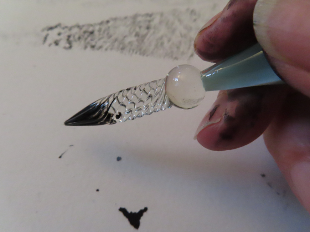 In my hand it feels cool and… ‘glassy’ as I dip it into the ink pot. The paper I am using is a watercolour paper and probably rougher than I would like. Nonetheless, I am pleased at the first few strokes—I even like the unintentional blots it leaves on the surface! I like the pen having a mind of its own!
