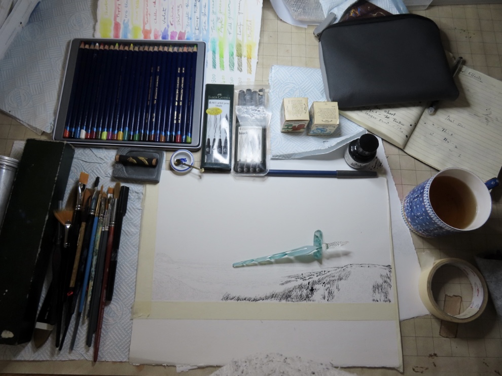 As you can see, I discovered quite a few of my old traditional drawing equipment hidden in the cupboard (It took me the best part of a day to find and sort out all these old materials and tools!). There are brushes and pens and inks that haven’t seen the light of day for a very long time! Also, on the table is my trusty tin of ‘use them all the time’ Inktense pencils (I love them nearly as much as the iPad!).