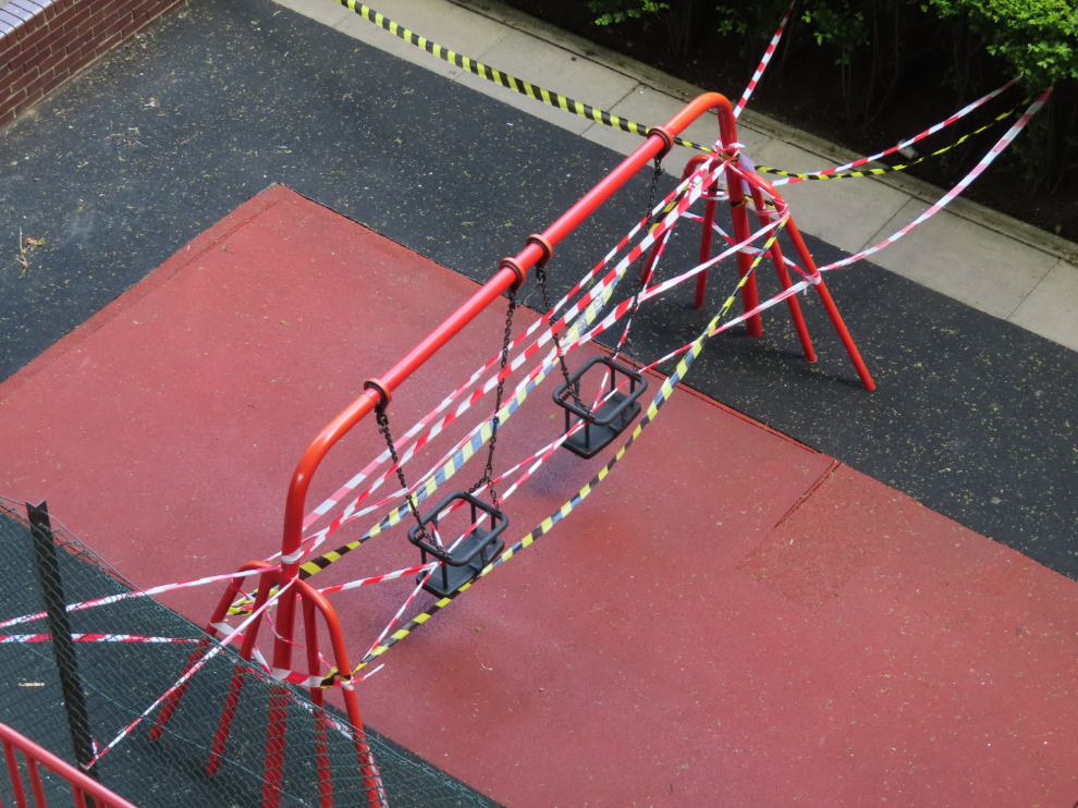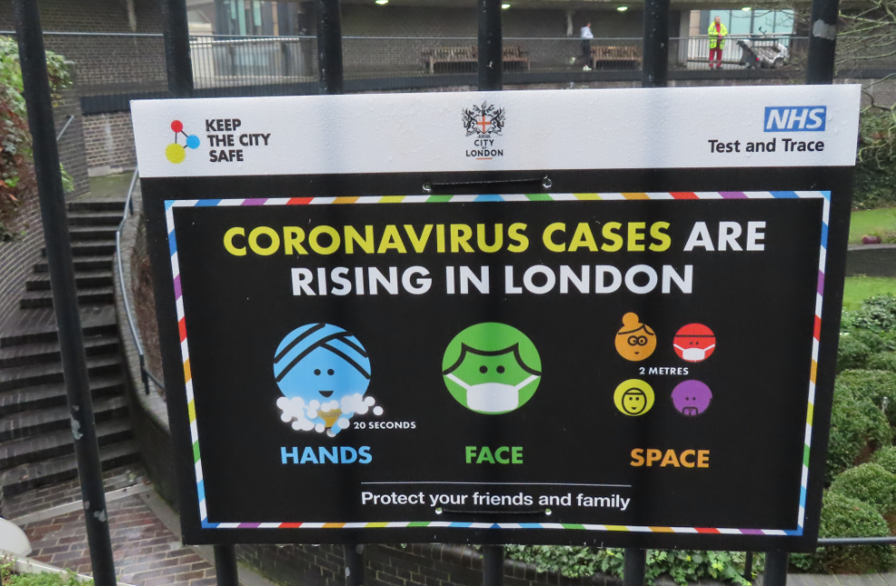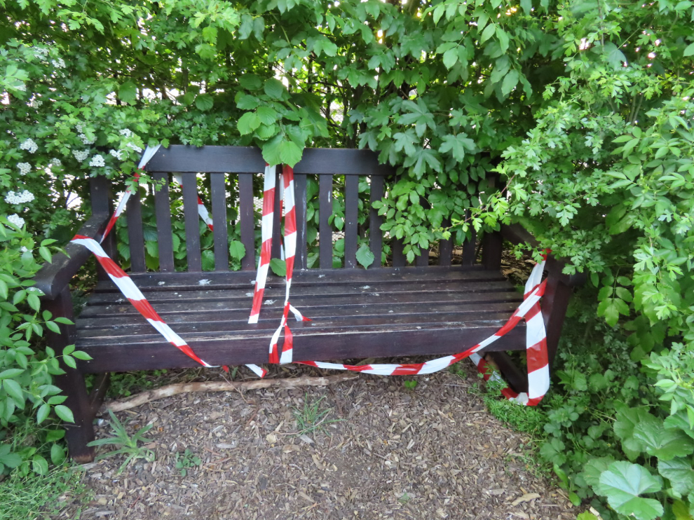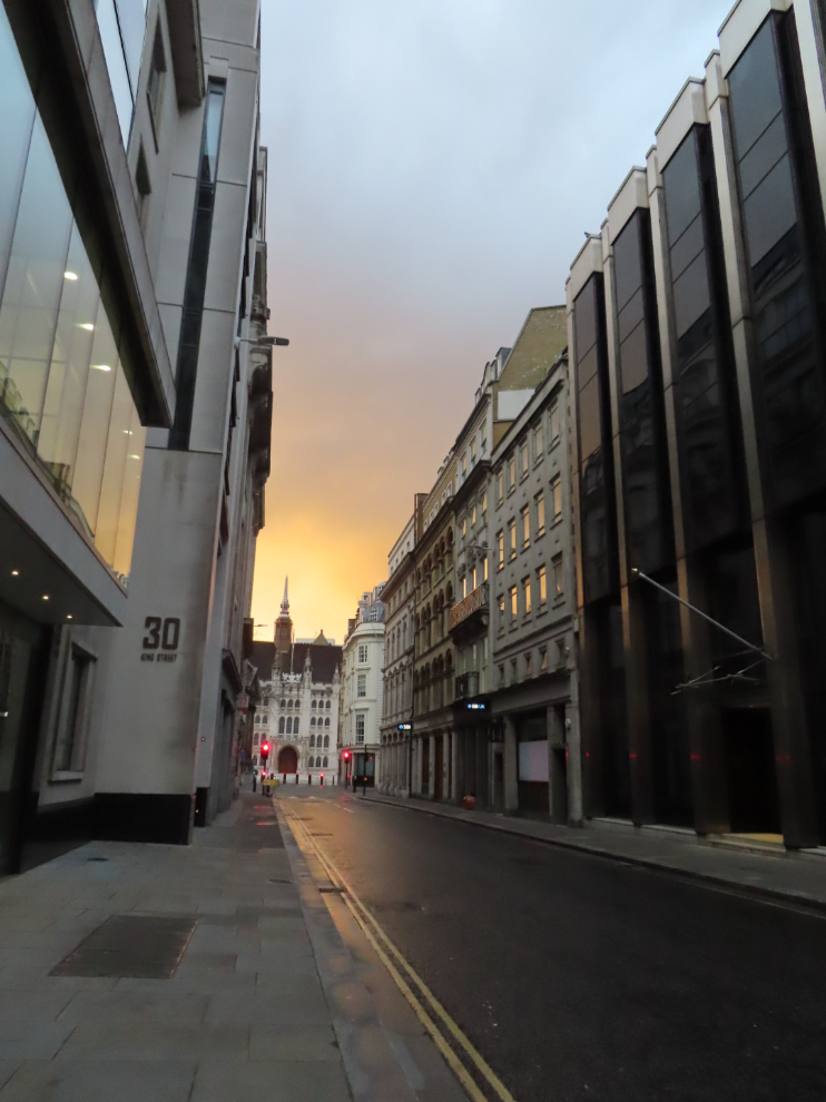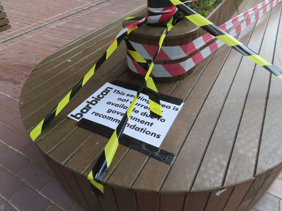 Joggers are everywhere claiming the streets causing panic among slower moving pedestrians — St Paul’s has no tourists crowding on the steps — Cautionary signs appear — I get track and traced and told to self isolate for ten days — Children’s swings and roundabouts are taped up — Benches and seats are sealed off — Southwark Bridge is never clear of traffic, but it is now! — Shop windows still display Christmas gifts (3rd lockdown) — Statues adopt the fashion for masks — A lone defiant red Ferrari waits at traffic lights on London Wall.