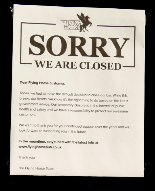 Along with almost everything else, the pubs close! Closed shuttered pubs are now a common sight in today’s desolate cityscape. Later, when restrictions eased a bit, we collected craft beer take-aways from an enterprising backstreet local — but once more, in what is now the third lockdown, we are without a brew as pubs continue to be closed.