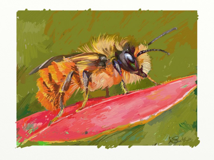 My knowledge of bees leaves a lot to be desired. Nevertheless, the footage (it’s very brief—perhaps it should be called ‘inch-age’?) inspired me to write my poem about the solitary bee—so the world should be grateful! 😂