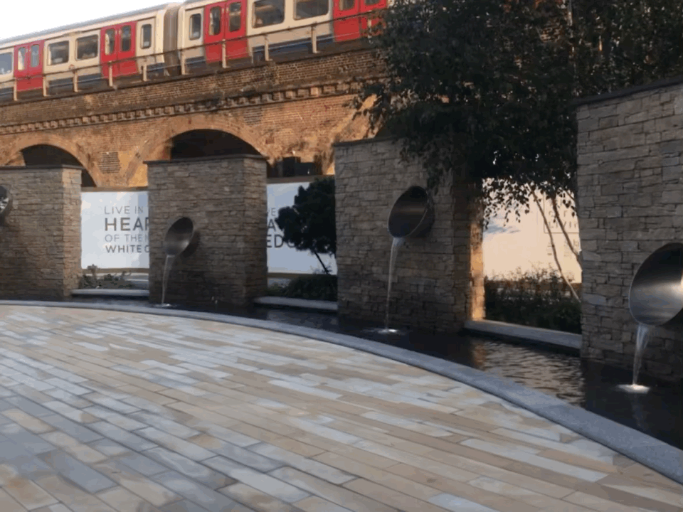 White City tube is about a 15-minute walk from the Playground Theatre or the Latimer Road station is about a 13-minute walk. I choose to travel to Wood Lane tube station (not shown on the theatre flyer map). It is the most convenient for me. The station is opposite the old BBC Television Centre and a few yards downhill of the White City station where Ania and I are to rendezvous. On my way to meet her, I stroll through a new park. The park is 5 acres within a modern housing development. I walk by contemporary water features as a fast tube train goes along a viaduct.
