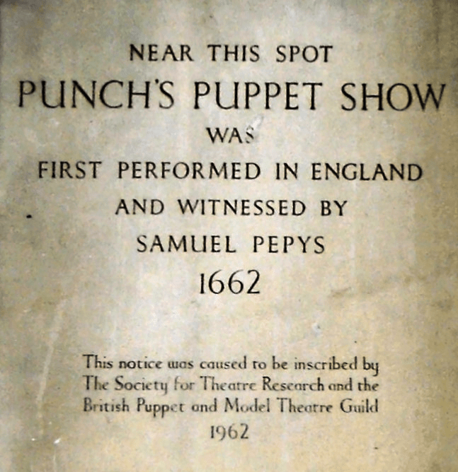 Samuel Pepys the Diarist may have seen one of the first Punch and Judy Puppet Shows performed at Covent Garden in 1662. A small brass plaque is placed at Covent Garden commemorating this moment in history.