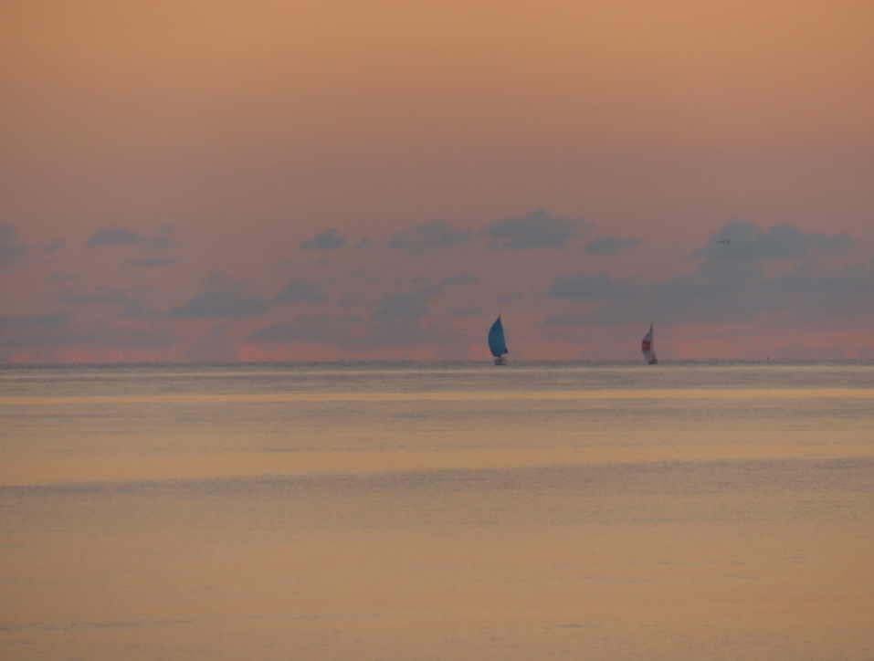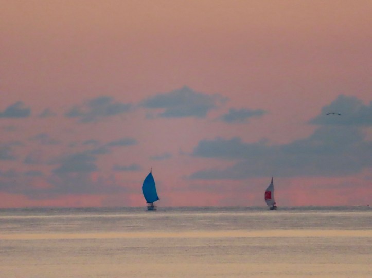 I want to write a poem about sailboats sailing downwind in a pink sunset. The colour pink is important to me as you can see from my photo—the sky is a deep pink. Okay, it has orange hues in it as well, but my memory from standing on the beach watching the yachts with their spinnakers under full sail… is that the sky is pink!