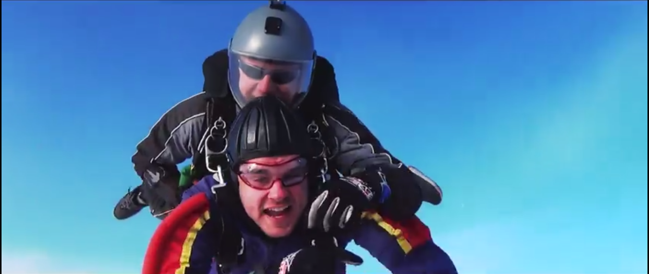 Benny jumping out of a plane: skydiving