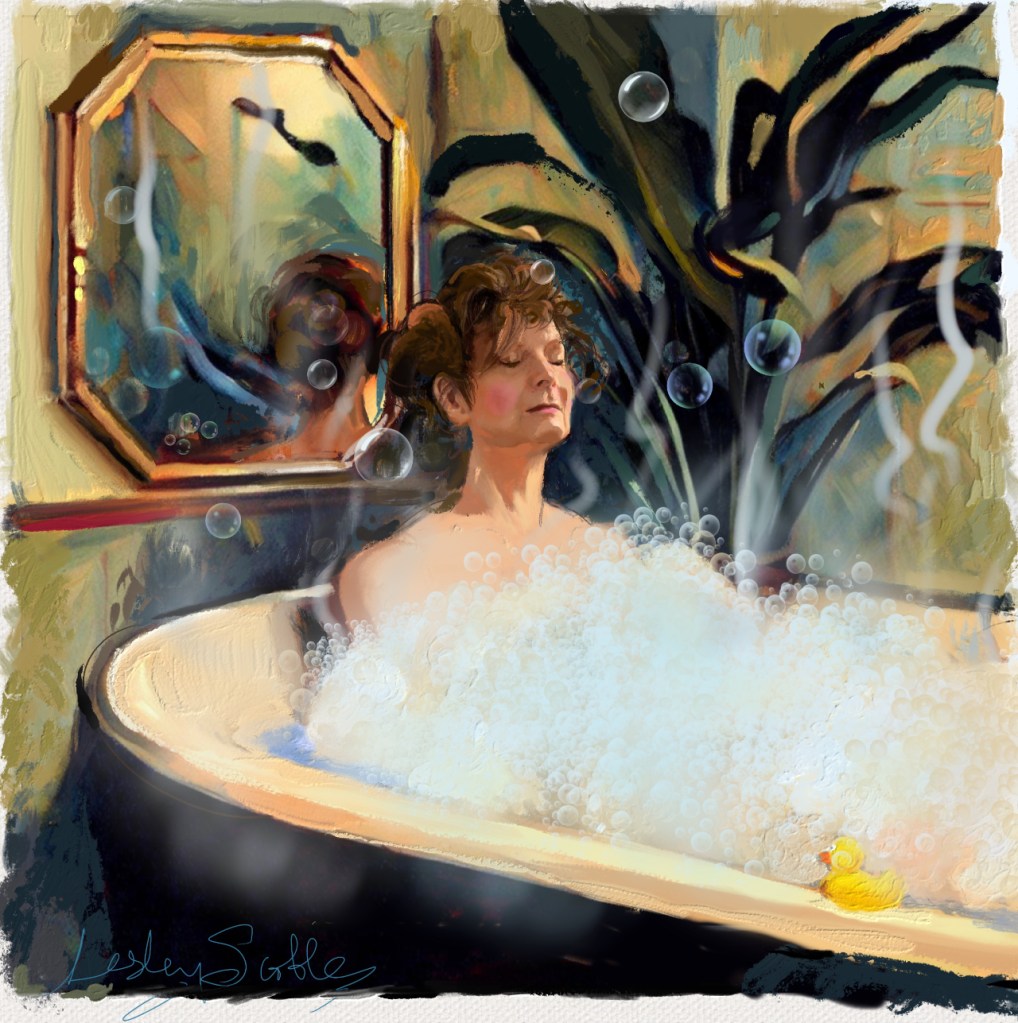 THE BATH The bath is where I reminisce The loo is where I… heed you this— The hot bath tub is where I think (I’m too fat to fit in the sink) I’ll wallow and bathe for a time Then, imagine some sort of rhyme The bath is a good place to soak, To conceive and construct a joke I dream in puffs of clouds above Of fantasy, drama and love To go boating on the high seas Undulate on waves and the breeze I dream of Shakespeare and Milton Drinking wine and eating Stilton Drifting off with Browning and Poe, Wordsworth, Byron and Longfellow I’m floating on a calm blue lake A shark then bites me—and I wake Soap up my nose!—I blow bubbles I cannot breathe!—I’m in troubles In a towel I hum a tune In the mirror I see a prune Lesley Scoble, July 1st
