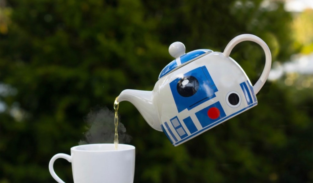 What do I see in this photo? I see a morning cuppa tea being poured into a cup…