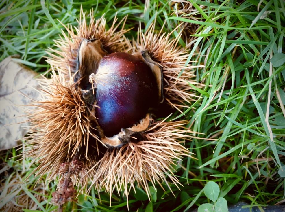 Chestnuts! Came into my mind straight away and my childhood joyful memories of running through golden woodlands to find as many conkers as possible. I was in awe of the shiny mahogany coloured polish of the surface of the nut. I couldn’t wait to get home to select my champion conker and skewer it and thread string through it, ready to knock my friend’s conkers into oblivion in the school playground.