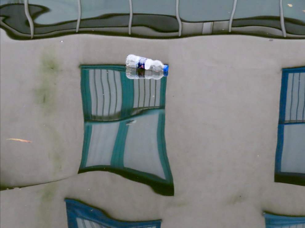 The distorted windows of a city house reflect in the littered pond. Their windows shifting shape and swinging in the same gentle rhythm of the floating plastic bottle boat. Their rectangular frames undulate, changing shape in time with the bottle creating an urban backcloth to its litter dance.