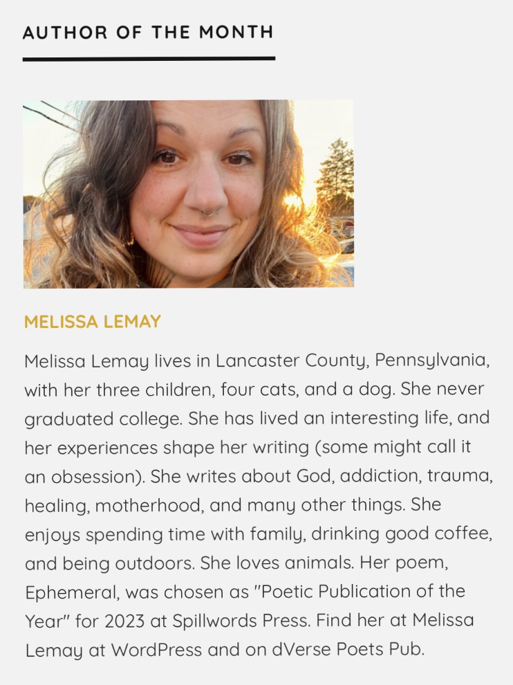 Thank you, Melissa Lemay, for your inspiring #FFFC prompt. Congratulations, on being Spillwords Press, Author of the Month! 👏🍾