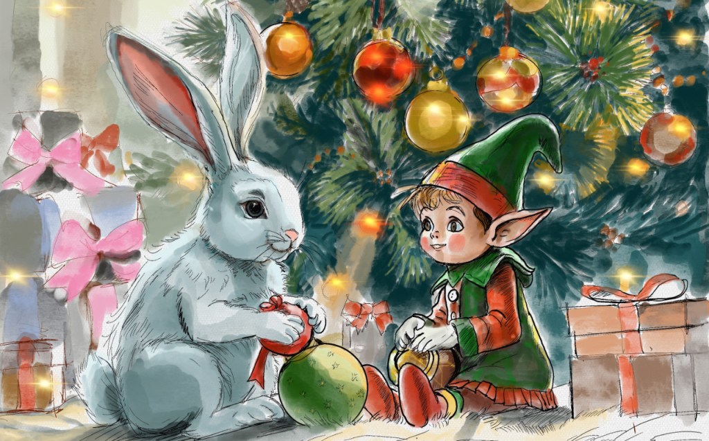 It is Christmas Eve. Everyone is in bed asleep, except for the pet rabbit who notices there is an elf hiding behind the sofa…