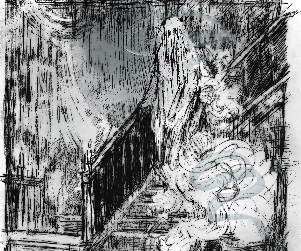 In “Last Page Before Midnight” (written & narrated by Lesley Scoble) the eerie atmosphere of a haunted manor is depicted. Shadows conceal spectres and chilling whispers, while a ghost wanders the staircase. Despite the frightful ambiance, moonlight and distant bells provide a contrasting backdrop, leading Lesley to close her ghost story.