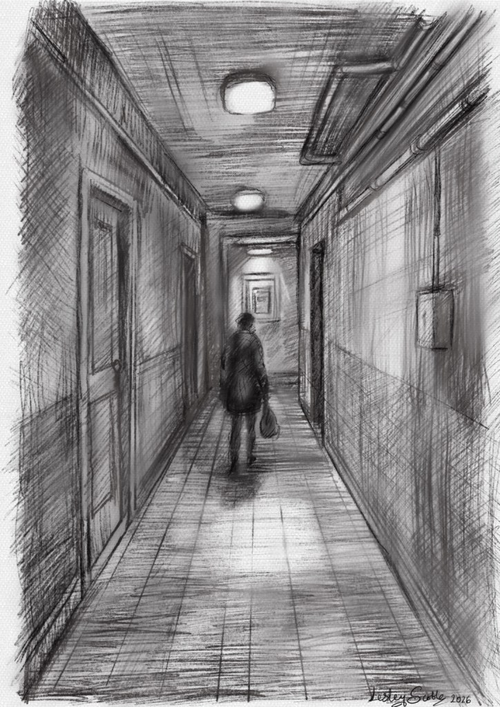 I wanted to follow her example of finding meaning in the ordinary — by letting a simple walk down a dim corridor, doing a mundane chore, open into something a little reflective, a little strange, and atmospheric. Her attention to small details helped guide me as I shaped this piece. I had a lot of fun trying to achieve it, anyway. And hey—welcome to my brand new ‘Corridor Poetry Form’!