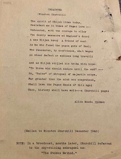 Her war poem Undaunted also inspired Sir Winston Churchill, who referred to it in a broadcast with the line “the sky‑raining shrapnel” as ‘The Stokes Method’ (sic: Stokes instead of Spokes).